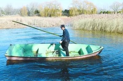 公园保安周宝红划船破冰,早晚各一次,为黑天鹅扩大水域,保证水面不结冰。