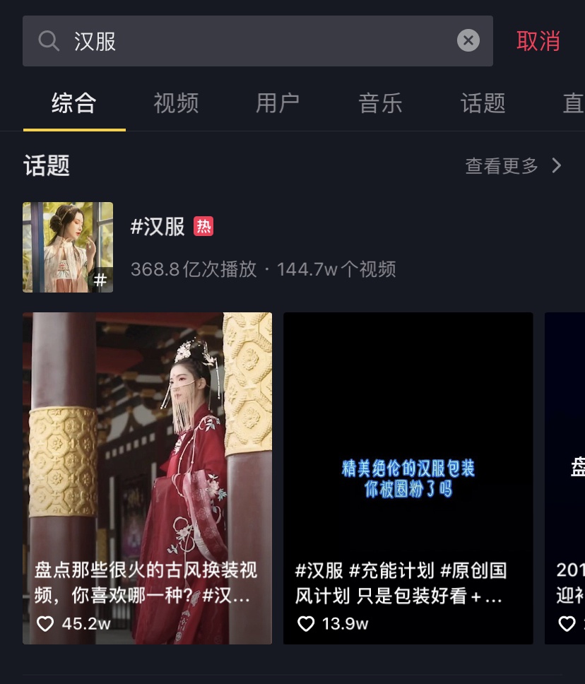 比如在自从古风歌曲《红昭愿》成为抖音热门BGM后,各类汉服变装、古风剧情类内容层出不迭,在抖音搜索汉服话题,相关内容已达到368.8亿播放,同时还有“汉服开箱”“汉服摄影”“汉服vlog”等衍生话题。
