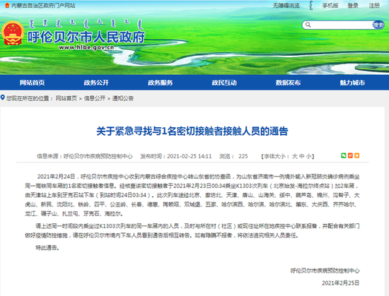 呼伦贝尔市人民政府网站消息:2021年2月24日,呼伦贝尔市疾控中心收到内蒙古综合疾控中心转山东省的协查函,为山东省济南市一例境外输入新冠肺炎确诊病例乘坐同一高铁同车厢的1名密切接触者信息。经核查该密切接触者于2021年2月23日00:34乘坐K1303次列车(北京始发-海拉尔终点站)加2车厢,由天津站上车到牙克石站下车(到站时间24日03:34)。此次列车途经北京、廊坊北、天津、唐山、山海关、绥中、葫芦岛、锦州、沟帮子、大虎山、新民、沈阳北、铁岭、四平、公主岭、长春、德惠、陶赖昭、双城堡、五家、哈尔滨西、哈尔滨、哈尔滨北、肇东、大庆西、齐齐哈尔、龙江、碾子山、扎兰屯、牙克石、海拉尔。