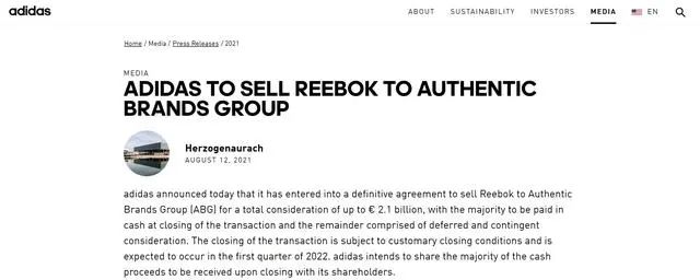 北京时间2021年8月13日凌晨,阿迪达斯宣布,与Authentic Brands Group (以下简称ABG)达成最终协议,将以21亿欧元(约合25亿美元)的总价出售锐步。