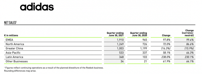 在这份业绩中,集团营收同比增长52%,其中北美地区收入增速87%,EMEA地区(欧洲、中东和非洲地区)收入增速99%,拉丁美洲增速230%,亚太地区增速只有66%。其中,大中华区是阿迪第二季度唯一一个收入负增长地区,收入同比下滑16%。