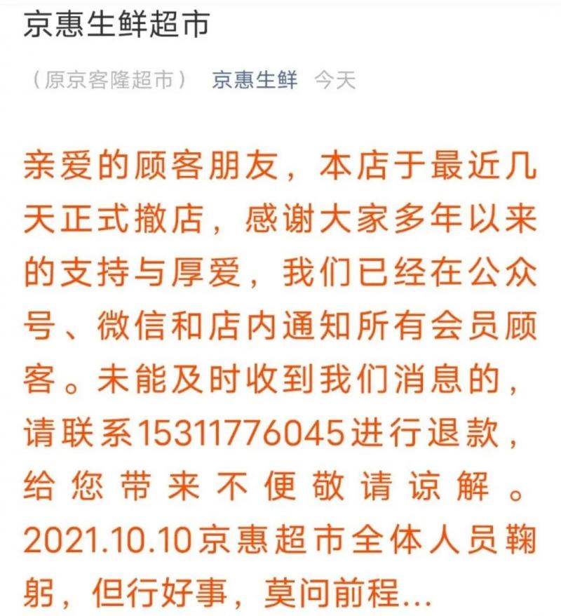10月10日位于通州区砖厂北里的京惠生鲜超市突然发布撤店通知,常在此处购物的居民们有点懵。“开了四五年了,怎们就关门了?”