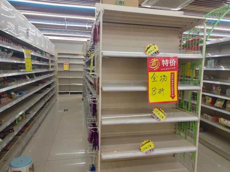 店内许多货架已经清空,随处可见贴着“8折”、“9折”字样的促销提示牌,有不少老人在店内购物,与收银店员十分熟络地谈话。有老人走进店里,看到空荡荡的货架,疑惑地问:“清仓了?”