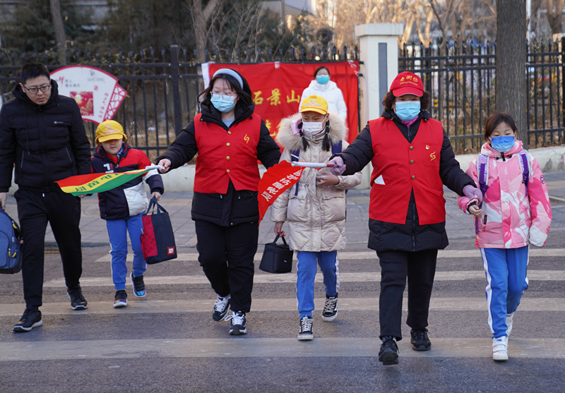 “来!快过来,牵好奶奶的手”、“谢谢奶奶!”,2月21日,石景山银河小学再次热闹起来,889名小学生将在今天正式开学。鲁谷街道“五芳园护花队”志愿者正在校门口护送一波又一波小学生返回学校。
