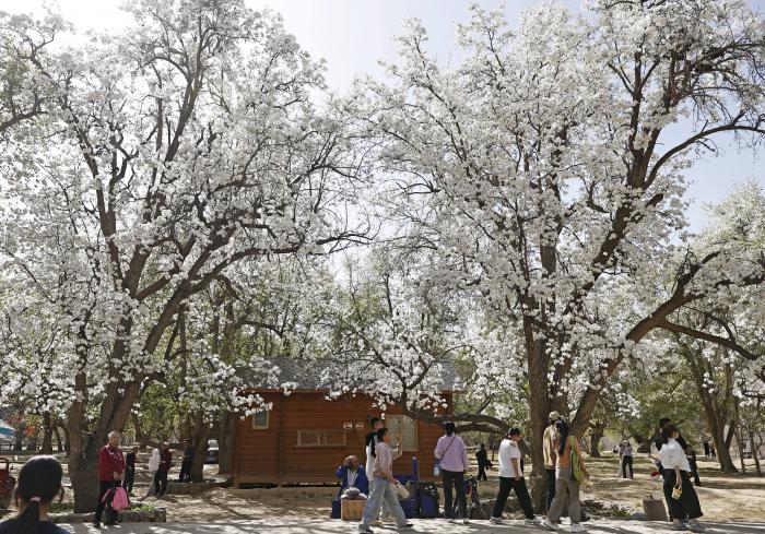 进入4月,位于宁夏中卫市沙坡头区黄河岸边南长滩村、北长滩村的数百棵百年梨树迎来盛花期。当地举办梨花节,吸引众多游客前来感受黄河岸边百年梨花与古村落的魅力。 新华社记者 王鹏 摄