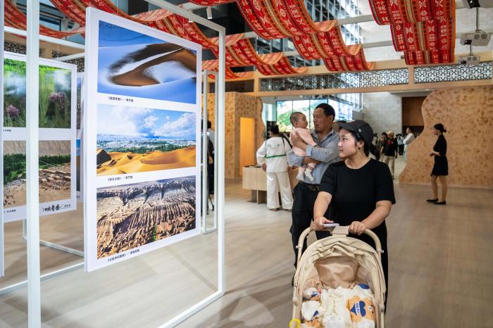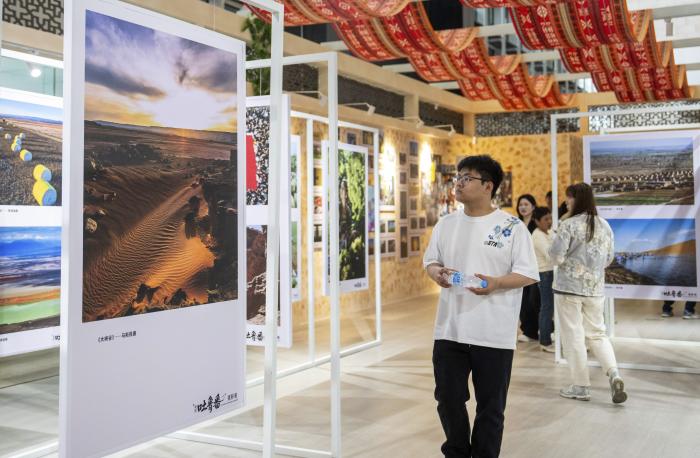 展览通过上百幅照片展现了新疆吐鲁番的风土人情、历史底蕴与时代风貌,生动讲述了湖南省对口支援吐鲁番市二十八年来,两地人民心手相连、共同发展的深情厚谊。4月9日,观众在湖南省博物馆参观“我的吐鲁番”摄影展。