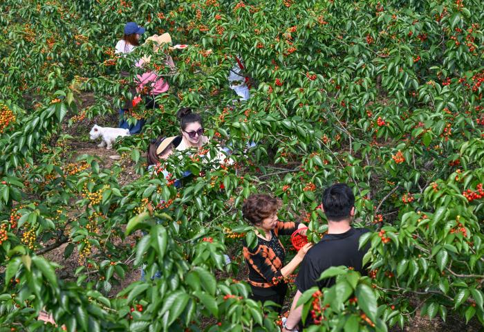 当地8000余亩樱桃正陆续成熟,采摘季将持续至4月底。近年来,重庆市璧山区大力发展樱桃产业,并积极推动农旅融合,助力乡村振兴。4月9日,游客在重庆市璧山区八塘镇云雾山樱桃谷采摘樱桃。