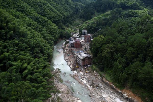 8月11日拍摄的浙江永嘉岩坦镇山早村山体滑坡灾害搜救现场。受超强台风“利奇马”影响,浙江永嘉山体滑坡灾害已致22人遇难,另有10人仍失联。