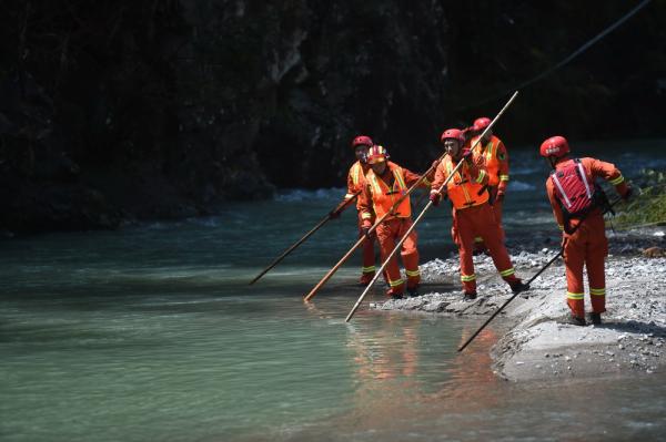 8月11日,救援人员在浙江永嘉岩坦镇山早村山体滑坡灾害现场的山早溪边开展搜救工作。