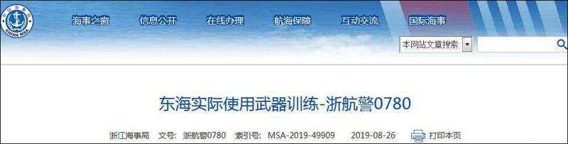中国海事局网站8月26日发布《东海实际使用武器训练-浙航警0780》。