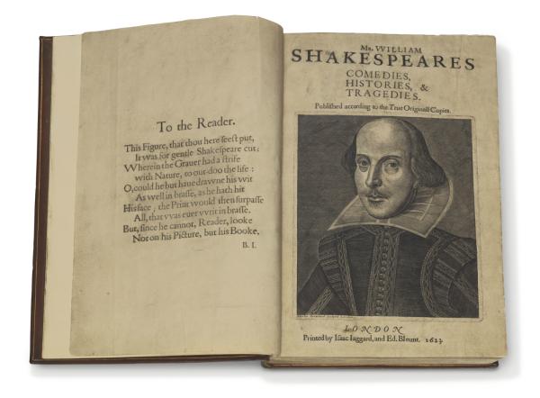 英国大文豪莎士比亚的剧本合集《威廉·莎士比亚喜剧、历史剧和悲剧》(Mr. William Shakespeares Comedies, Histories, & Tragedies),也即公众所熟知的《第一对开本》(First Folio),将于4月24日在佳士得纽约古典艺术周期间的“尊尚珍品(Exceptional Sale)”专场拍卖中隆重呈献。