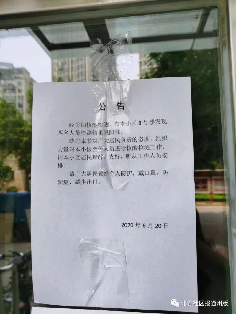 今天(6月20日),有读者向北青社区报(微信号:tongzhoushequbao)反映称,位于通州区北苑的天时名苑小区,出现身着防护服的医护人员,并有“公告”张贴在小区里,“公告”称天时名苑小区有两人核酸检测为阳性,将对小区全体人员进行核酸检测。