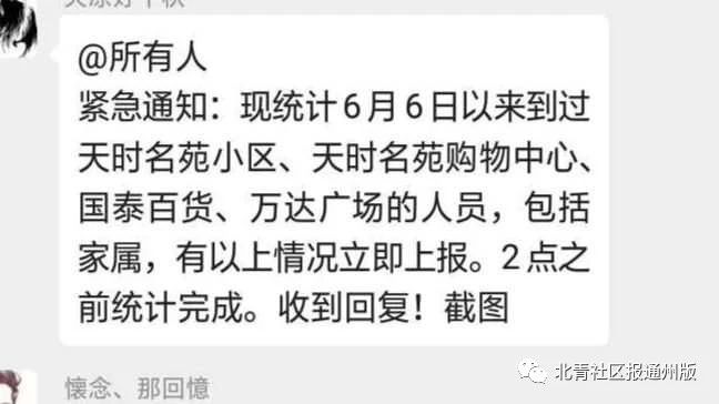 北青社区报记者了解到,目前相关部门已开始紧急排查相关人员情况:一是居住在通州区天时名苑小区的人员(通州区杨庄路2号);二是自6月6日以来,进出过通州天时名苑小区人员;三是自6月6日以来,进出过通州区万达广场、国泰百货、华联天时名苑购物中心人员。