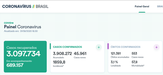 海外网9月1日电 据巴西卫生部当地时间8月31日晚公布的最新数据,该国单日新增新冠肺炎确诊病例45961例,累计确诊3908272例;新增死亡病例553例,累计死亡病例121381例。目前,巴西确诊病例和死亡病例仍居全球第二,仅次于美国。