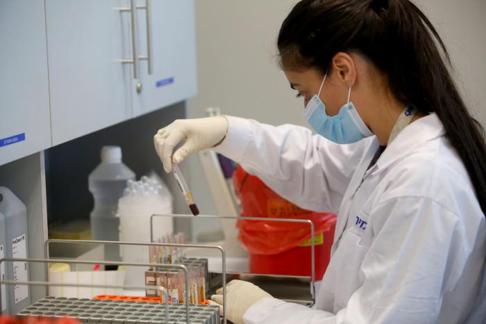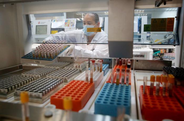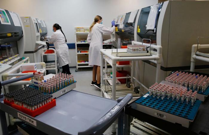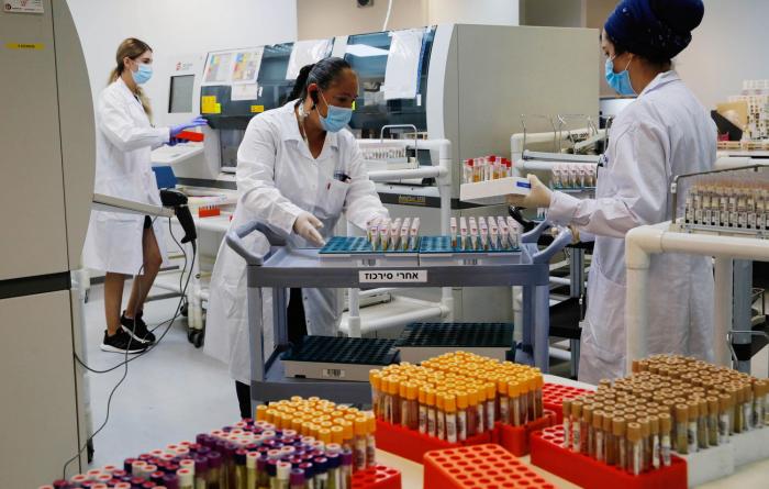 9月13日,在以色列中部城市奥尔耶胡达的一处实验室,技术人员进行新冠病毒血清学检测。