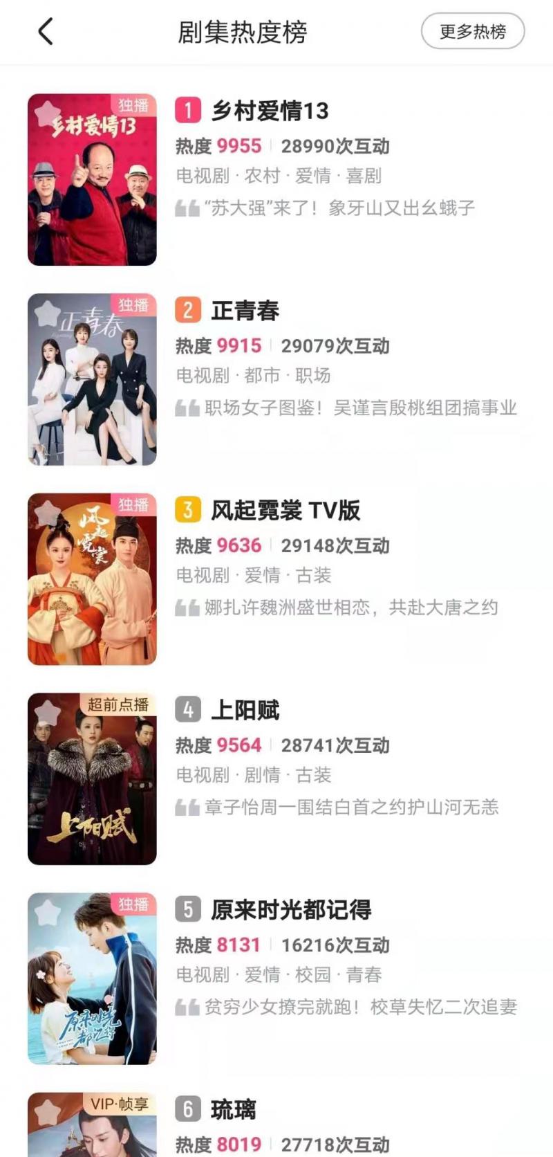 除了《乡村爱情13》,今年春节档优酷合家欢剧场还有该系列的11和12、《刘老根3》《都挺好》等东北乡村与都市情感题材剧集,打造最强春节档供人们度过春节假期。此外,《风气霓裳》《觉醒年代》等不同题材和类型的剧集也于年前在优酷上线,供不同喜好的用户选择。截至目前,《觉醒年代》豆瓣评分8.7,宏大主题兼精良质感排名优酷历史剧热榜第一,《风气霓裳》也连续多日在网上成为话题。