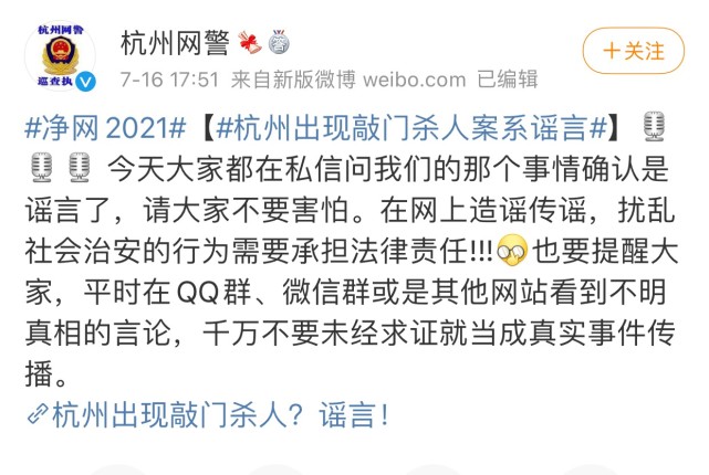 7月16日,一网友发帖称,遭到陌生人敲门她没有开门,随后该陌生人敲另外一户人家,有女生开门后被砍。据杭州网警7月16日消息,今天(16日)大家都在私信的事情确认是谣言,请大家不要害怕。在网上造谣传谣,扰乱社会治安的行为需要承担法律责任。