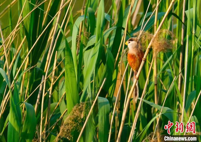 在永清县曹家务乡通泽村,摄影爱好者拍摄到的被誉为“鸟中大熊猫”的震旦鸦雀