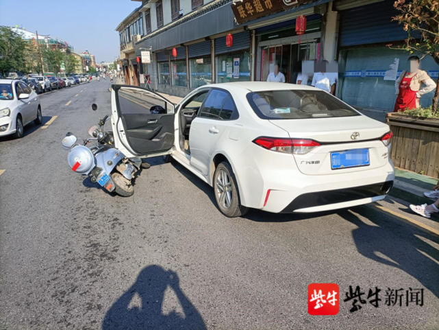 近日,南京江宁淳化交警中队接到报警,称在辖区土桥桂园南路上,一辆小型轿车跟电动车发生碰撞,电动车撞上了小轿车突然打开的车门,导致连人带车摔倒在地。