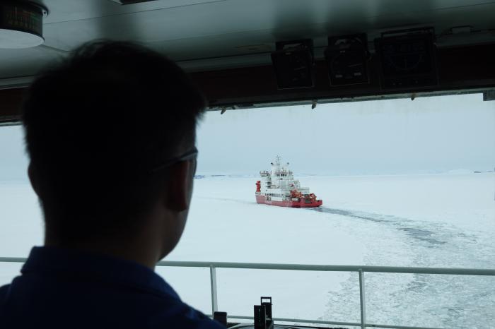 船时12月4日晚间,“雪龙”兄弟成功汇合。船时12月5日下午3时许,“雪龙2”号已将“雪龙”号引航至预定作业点,两船将在该作业点共同完成后续卸货任务。这是在“雪龙”号驾驶舱拍摄的“雪龙2”号(12月5日)。新华社记者 顾天成 摄