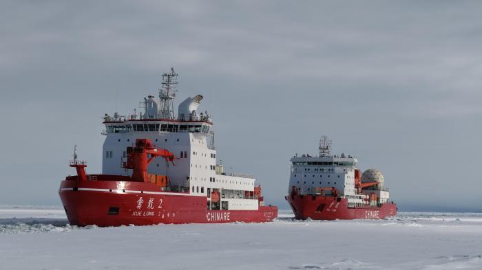 两船当日协同开展中山站区域大规模卸货作业。12月5日,“雪龙2”号(前)在为“雪龙”号破冰引航(无人机照片)。新华社发(陈栋彬摄)