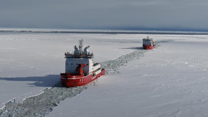 综合天气、冰情等因素研判,船时12月4日,中国第42次南极考察队决定,“雪龙2”号暂停卸货作业,以艉向破冰的方式退出作业点,为“雪龙”号破冰引航。12月5日,“雪龙2”号(前)在为“雪龙”号破冰引航(无人机照片)。新华社发(陈栋彬摄)