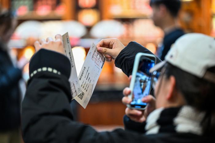 12月4日,在天津市红桥区谦祥益相声茶馆,观众在演出前拍摄票根。新华社记者 赵子硕 摄