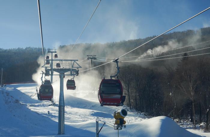这是12月2日在吉林市北大湖滑雪度假区拍摄的由北京起重运输机械设计研究院和徐州天马索道缆车设备有限公司共同研发生产的缆车。据介绍,北大湖滑雪度假区的缆车国产化达90%以上。