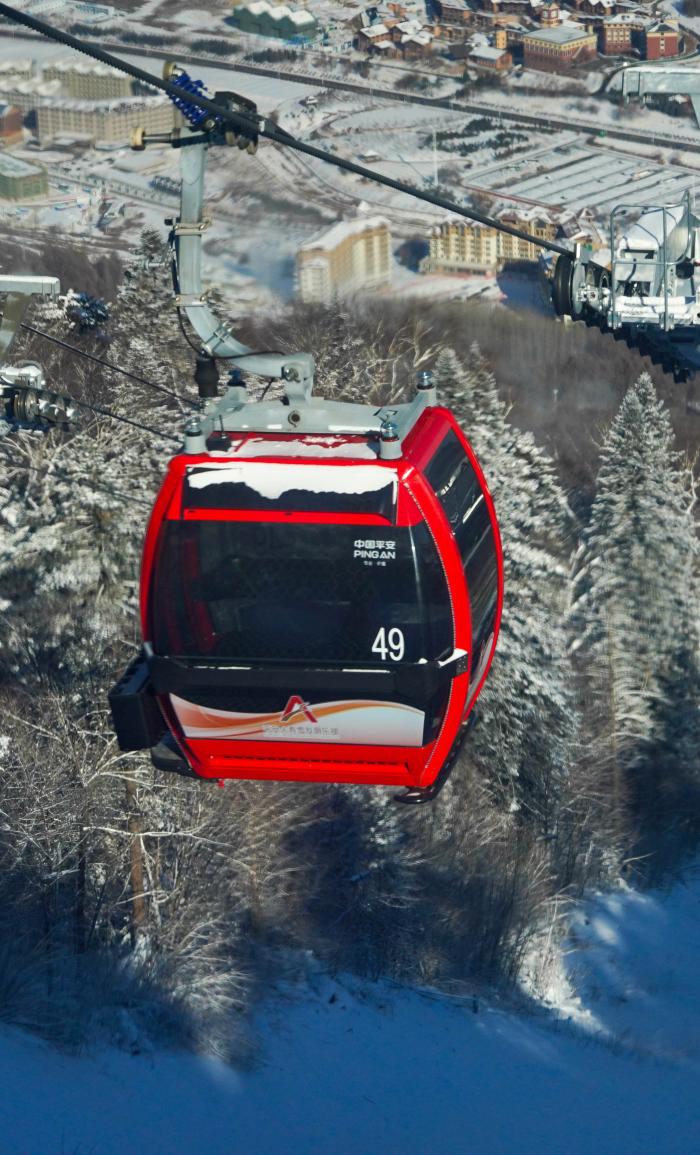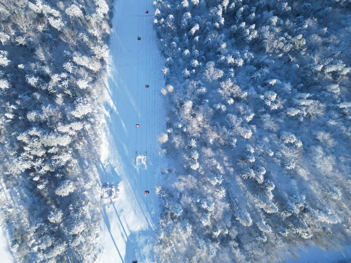 随着冰雪运动的普及和科技创新深化,我国冰雪装备制造正向智能化、高端化、绿色化方向加速升级,冰雪装备制造正成为推动冰雪经济持续增长的新动能。这是12月2日在吉林市北大湖滑雪度假区拍摄的由北京起重运输机械设计研究院和徐州天马索道缆车设备有限公司共同研发生产的缆车(无人机照片)。据介绍,北大湖滑雪度假区的缆车国产化达90%以上。