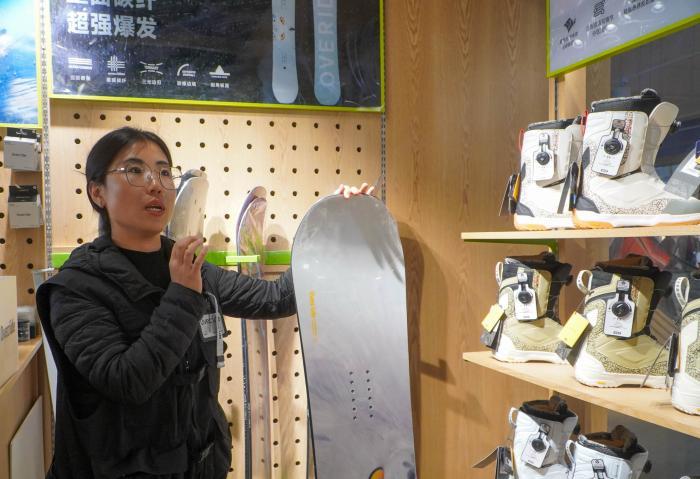 在吉林北大湖滑雪度假区商业街内的一家国产品牌雪具店内,工作人员展示我国自主研发生产的滑雪板(2024年11月15日摄)。