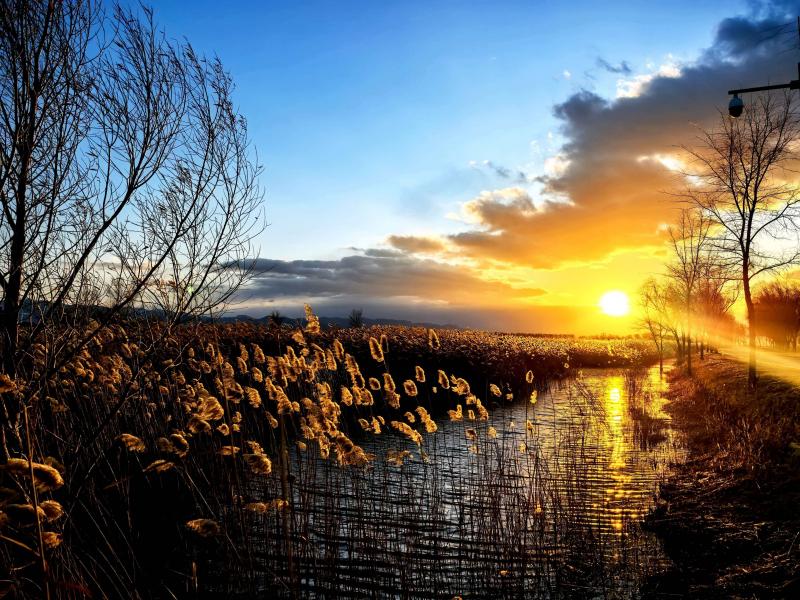 落霞与孤鹜齐飞,野鸭湖湿地再现中国式浪漫意境