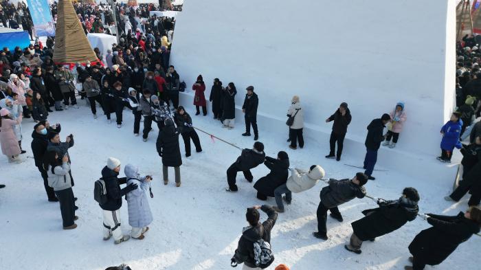 12月7日在第六届哈尔滨采冰节现场拍摄的拔河活动(无人机照片)。新华社发(刘洋 摄)