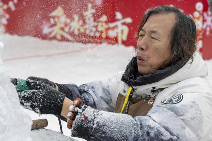 12月7日,冰雕师在第六届哈尔滨采冰节现场制作冰雕。新华社记者 张涛 摄