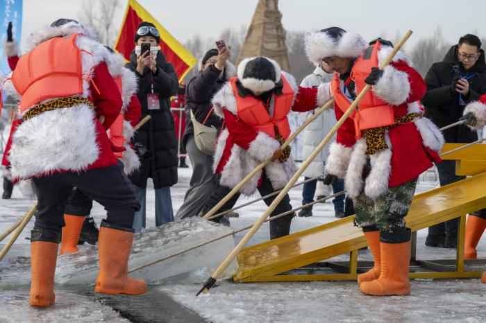 12月7日,在第六届哈尔滨采冰节现场,“冰把头”带领“采冰汉子”运送头冰。新华社发(杨威 摄)