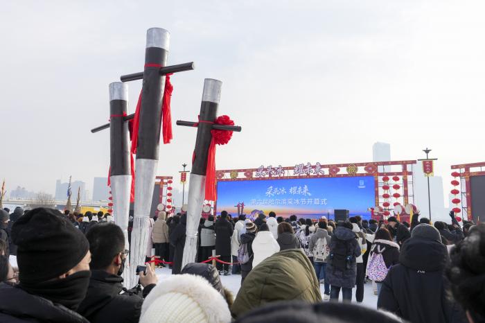 12月7日,人们在第六届哈尔滨采冰节现场与从松花江采出的“头冰”合影(无人机照片)。新华社记者 王松 摄