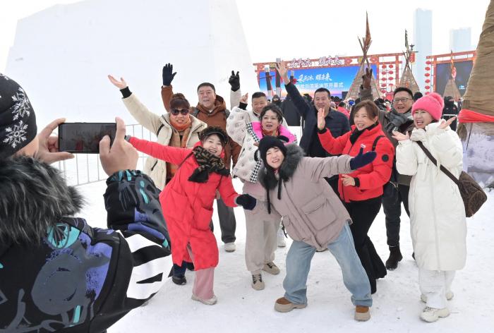 12月7日,在第六届哈尔滨采冰节现场,游客在现场合影留念。新华社发(原勇 摄)