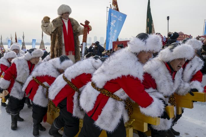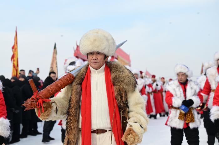 这是12月7日拍摄的第六届哈尔滨采冰节现场的民俗表演。新华社记者 王松 摄