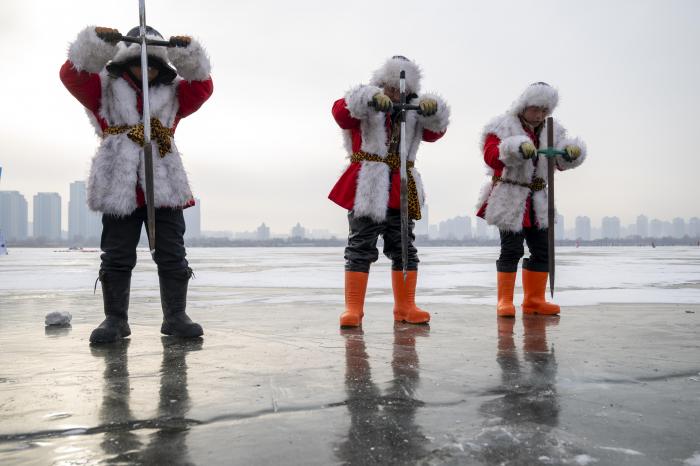 12月7日,装扮成“采冰汉子”的采冰人员在现场采冰。新华社记者 张涛 摄