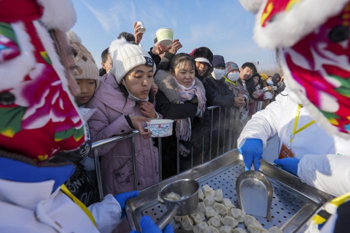 12月7日,人们在第六届哈尔滨采冰节冰雪大市集上品尝饺子。新华社记者 王松 摄