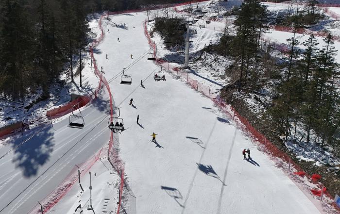 12月7日,在汶川羌人谷滑雪场,滑雪爱好者乘坐吊椅前往雪道顶(无人机照片)。