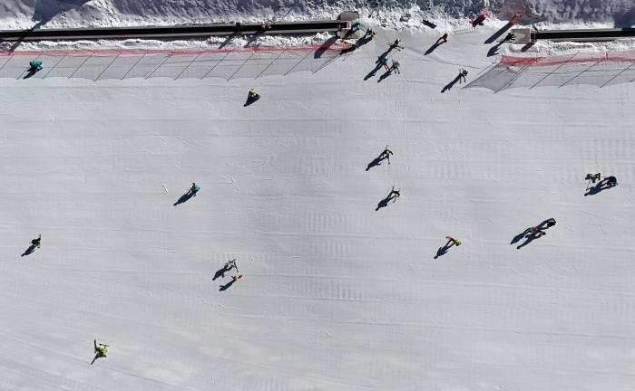12月7日,在汶川羌人谷滑雪场,众多滑雪爱好者在雪道顶准备出发(无人机照片)。