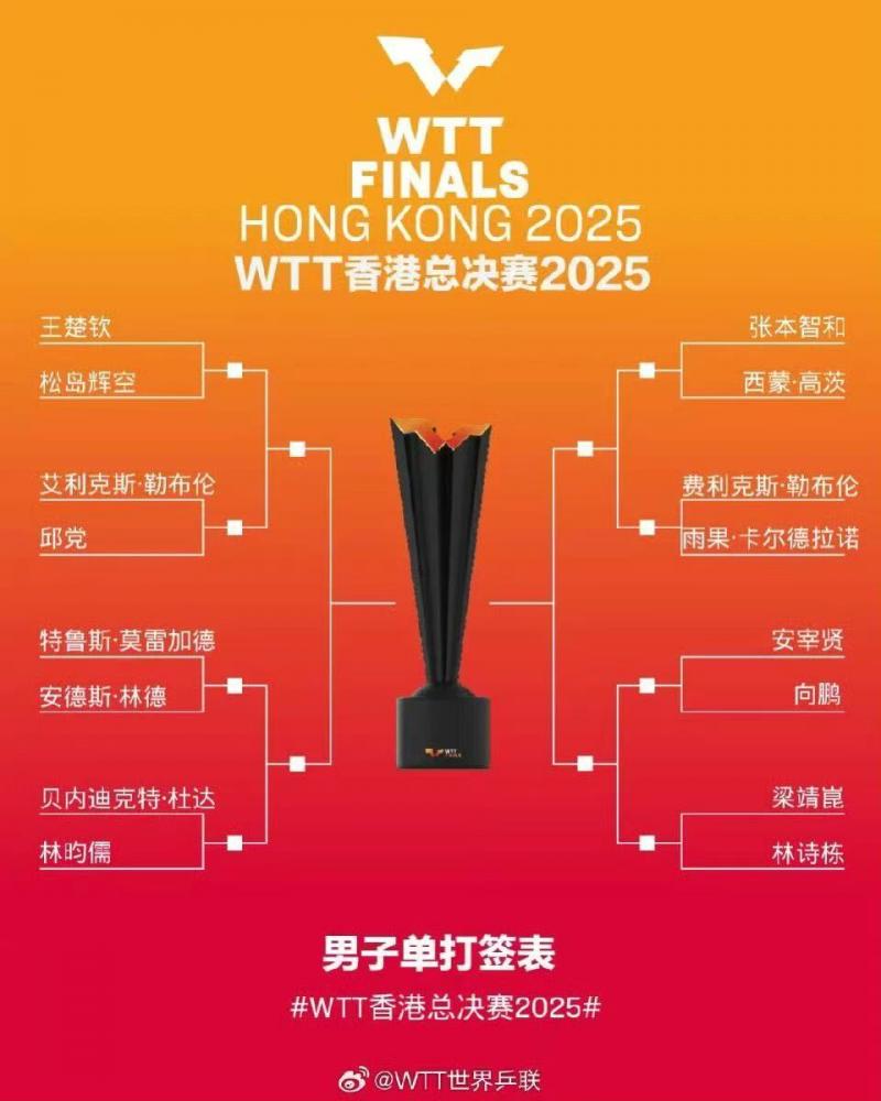 WTT香港总决赛2025将于12月10日至14日在中国香港红磡体育馆举行。8日下午,本届赛事进行了抽签。女单方面,卫冕冠军王曼昱首轮对阵日本球员张本美和,世界第一孙颖莎首轮迎战队友王艺迪;男单方面,王楚钦一人处在上半区,他首轮将对阵日本选手松岛辉空。