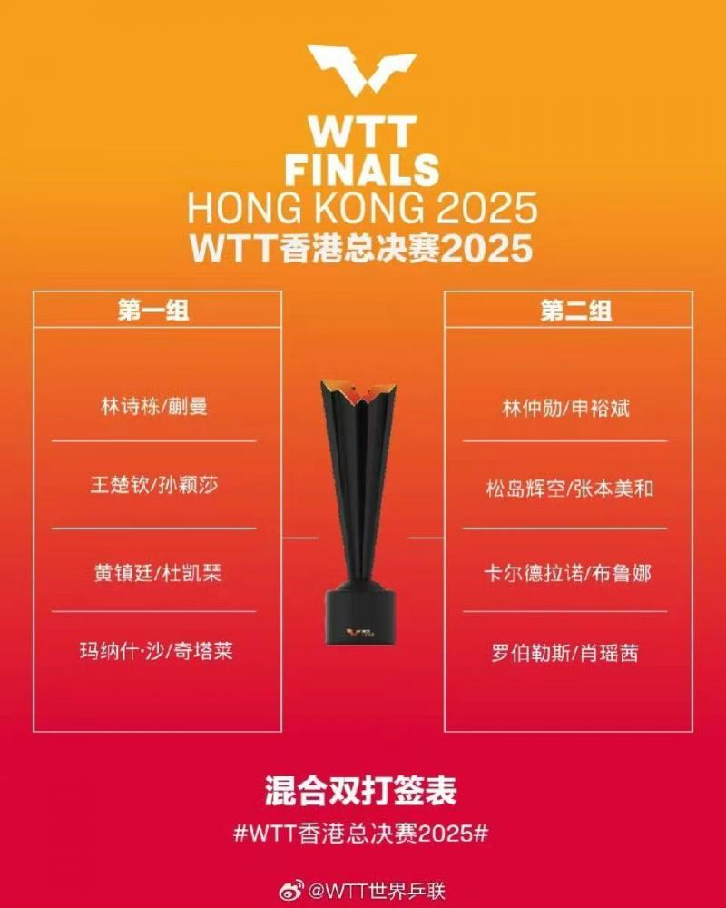 混双项目第一阶段的分组情况也已揭晓,中国队派出两对组合参赛,林诗栋/蒯曼与王楚钦/孙颖莎被分在同一组。