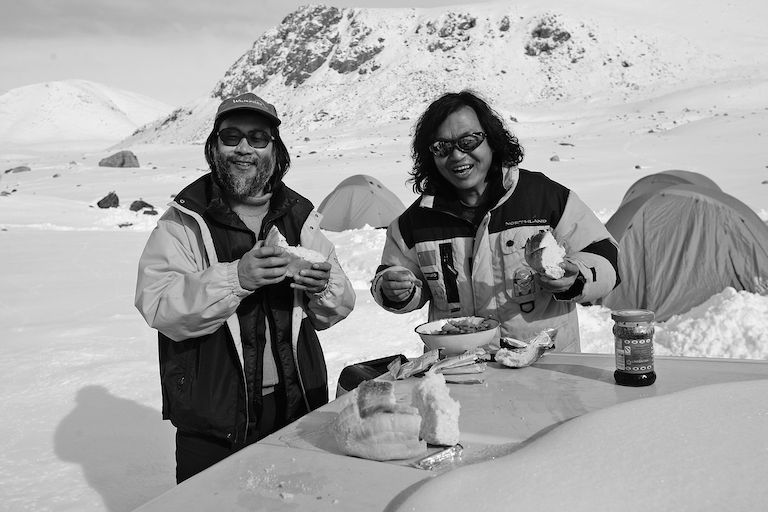 长江源考察中被大雪围困,孙建军(右)和杨欣(左)两个人的生日享用一个大饼