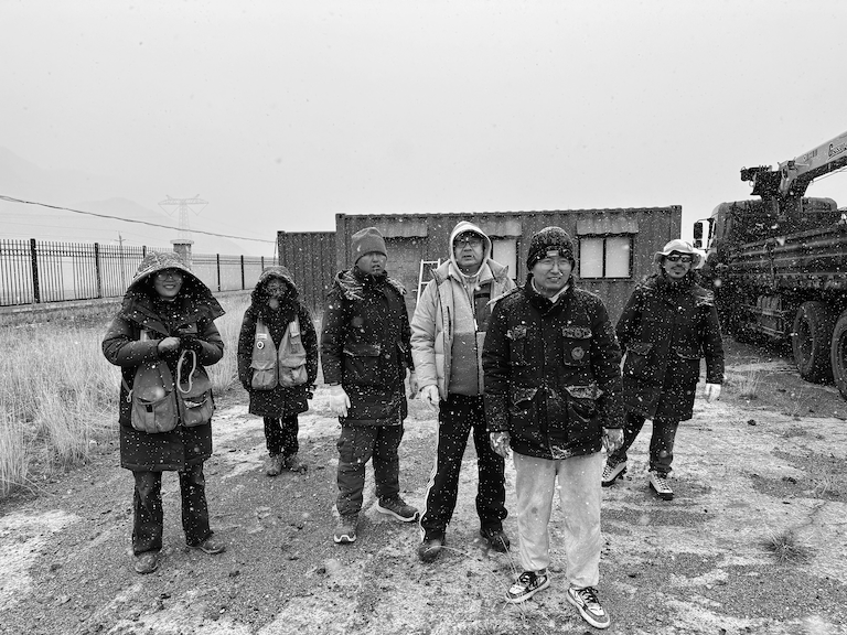 昆仑山下,雪中的志愿者维护绿色驿站设施现场的合影。右三为肖立(摄影:史晶)
