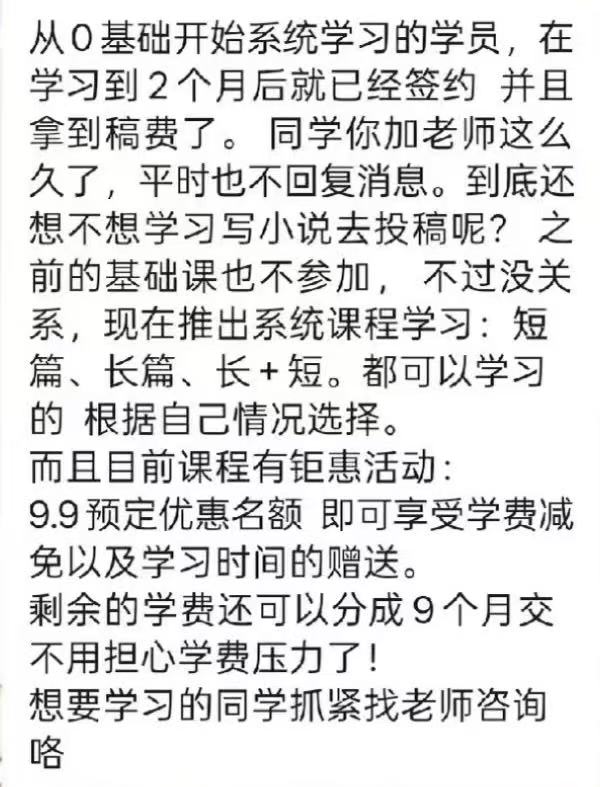 上课仅半个月,课程质量便断崖式下滑。前期仅有的写作框架、人物设定等相关内容消失殆尽,后续全程“水课”,毫无学习价值。紧接着该机构又以“三周年庆”为由,向她推销高价提升班,声称授课老师均为头部网文平台的签约作者,还承诺为她配备三位专属辅导老师。此时黄女士已对机构失去信任,明确拒绝报名,可对方仍旧纠缠她近半月,一边假意吹捧她的写作资质,一边反复画饼“只要一边写小说一边上课,就能轻松赚回学费”。