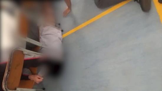 视频中,一名男生在教室遭约7个同学按倒在地并用椅子围困。这些同学一边扭这名男生的耳朵,还脱掉他裤子,内裤也被褪至大腿位置,屁股外露,这几个男同学一边嬉笑,一边多次拍打其屁股,其他男生则在旁起哄。