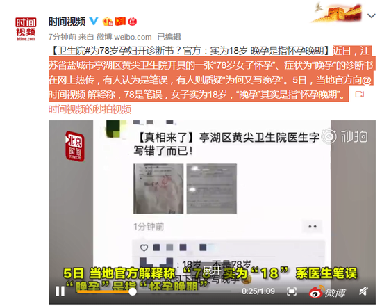 近日,江苏省盐城市亭湖区黄尖卫生院开具的一张“78岁女子怀孕”、症状为“晚孕”的诊断书在网上热传,有人认为是笔误,有人则质疑“为何又写晚孕”。5日,当地官方向@时间视频 解释称,78是笔误,女子实为18岁,“晚孕”其实是指“怀孕晚期”。
