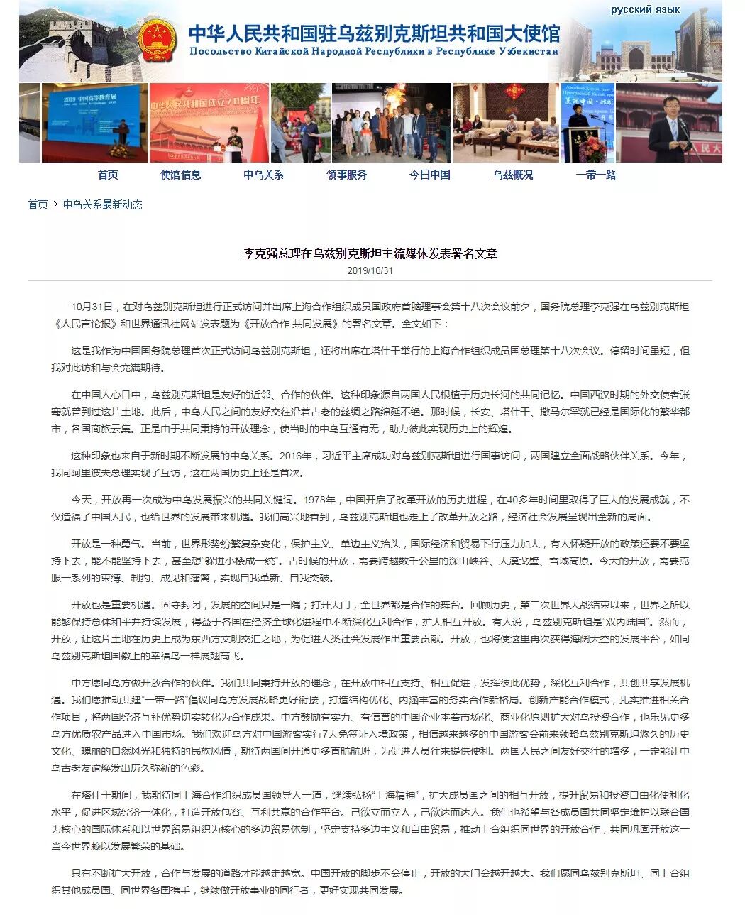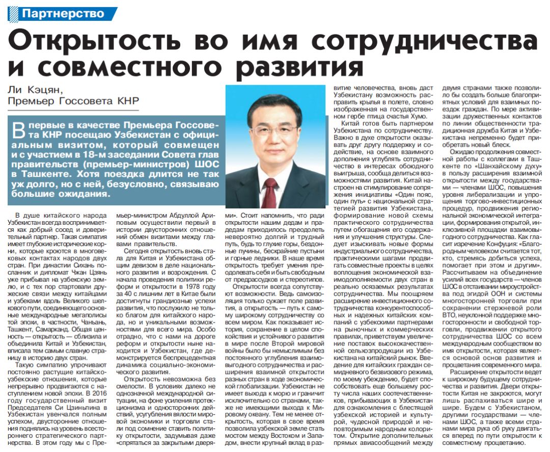 10月31日,在对乌兹别克斯坦进行正式访问并出席上海合作组织成员国政府首脑(总理)理事会第十八次会议前夕,国务院总理李克强在乌兹别克斯坦《人民言论报》和世界通讯社网站发表题为《开放合作 共同发展》的署名文章。全文如下: