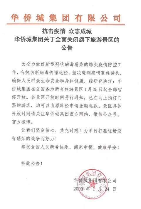 抗击疫情!华侨城新年第一吼:全面关闭旗下旅游景区